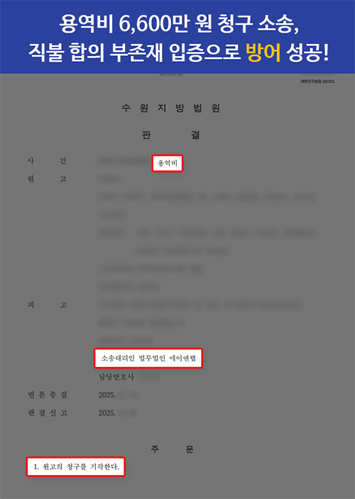 의뢰인은 확인서 내용에 따라 원청 회사의 요청대로 잔금을 모두 지급하였으나, 이후 원청 회사가 파산 위기에 놓이자 원고는 의뢰인이 자신들에게 직접 6,600만 원의 용역비를 지급해야 한다며 소송을 제기하였습니다.
